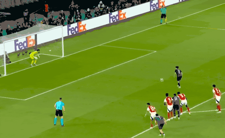 第63分鐘,薩卡禁區(qū)右側(cè)橫向擺脫之間突然起腳,多納魯馬騰空而起,用指尖將球托了出去。