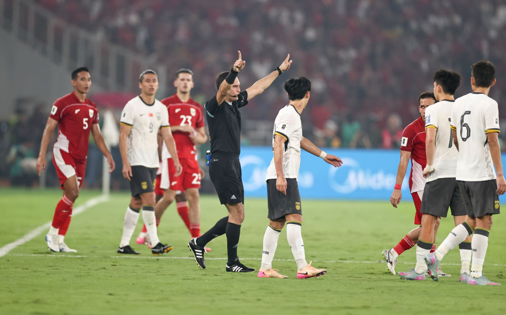6月5日,在2026年美加墨世界杯亞洲區(qū)預選賽18強賽第九輪中國隊與印尼隊的比賽中,主裁判在查看VAR(視頻助理裁判)后判給印尼隊一粒點球。足球日報記者 賈浩成 攝